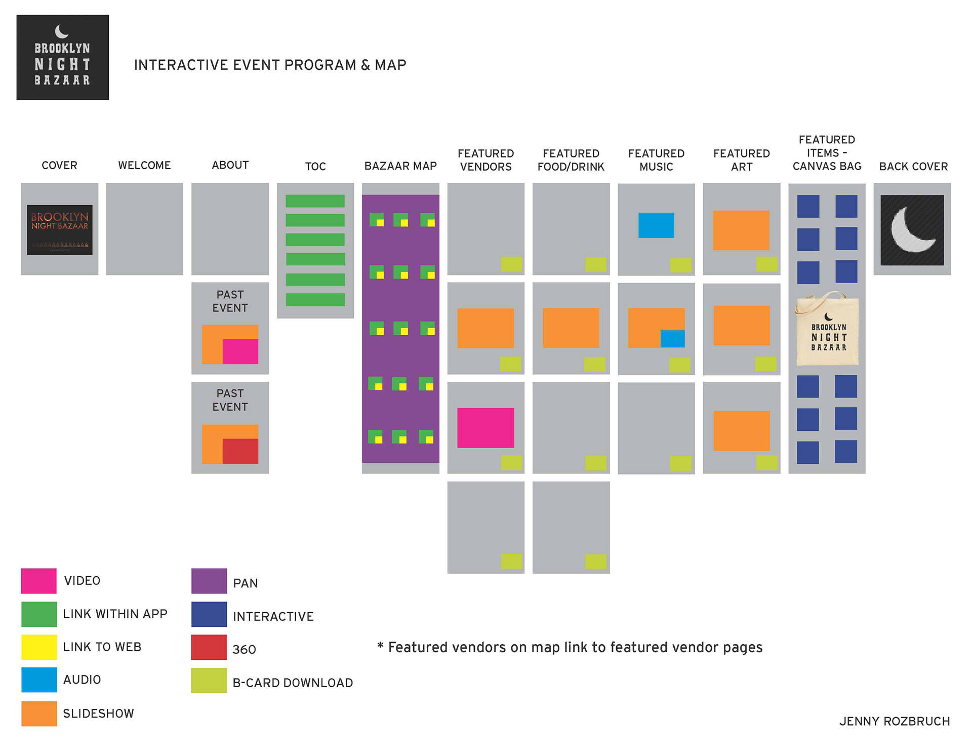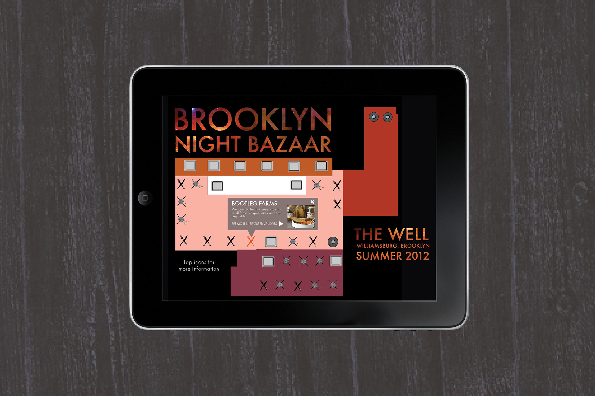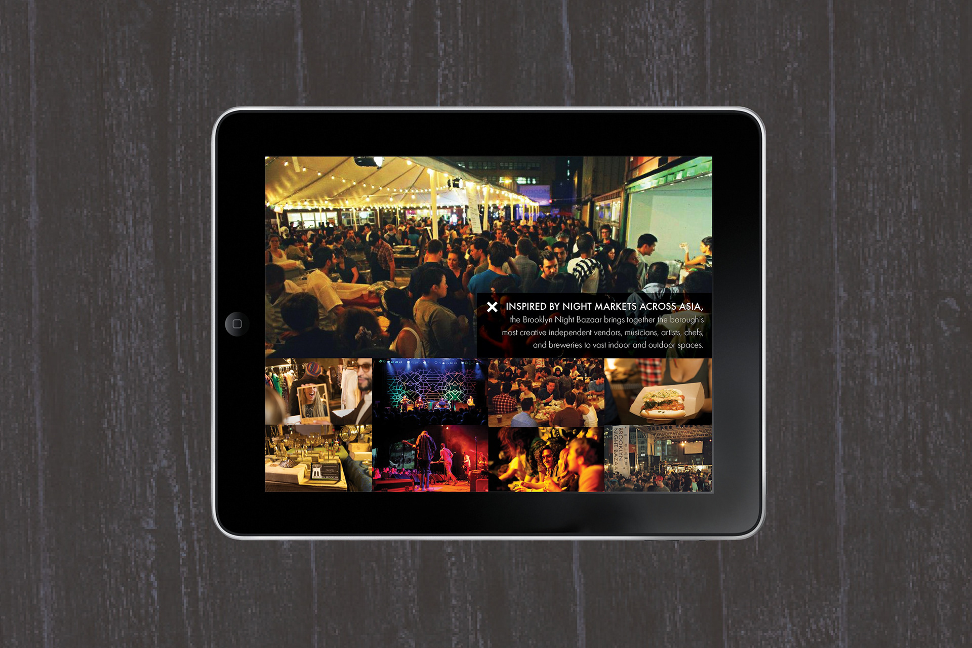 The Brooklyn Night Bazaar is a night market in Brooklyn that hosts hundreds of New York's most inspired and creative independent vendors, artists, musicians and chefs. This interactive event program is a guide to the Bazaar's vendors on a given night, highlighting specific artists and their craft through in-depth interviews, as well as serving as a map and guide to the space and activities offered. Viewers can also bookmark or purchase products of interest that they missed on site, or plan to check out at the event. http://bkbazaar.com