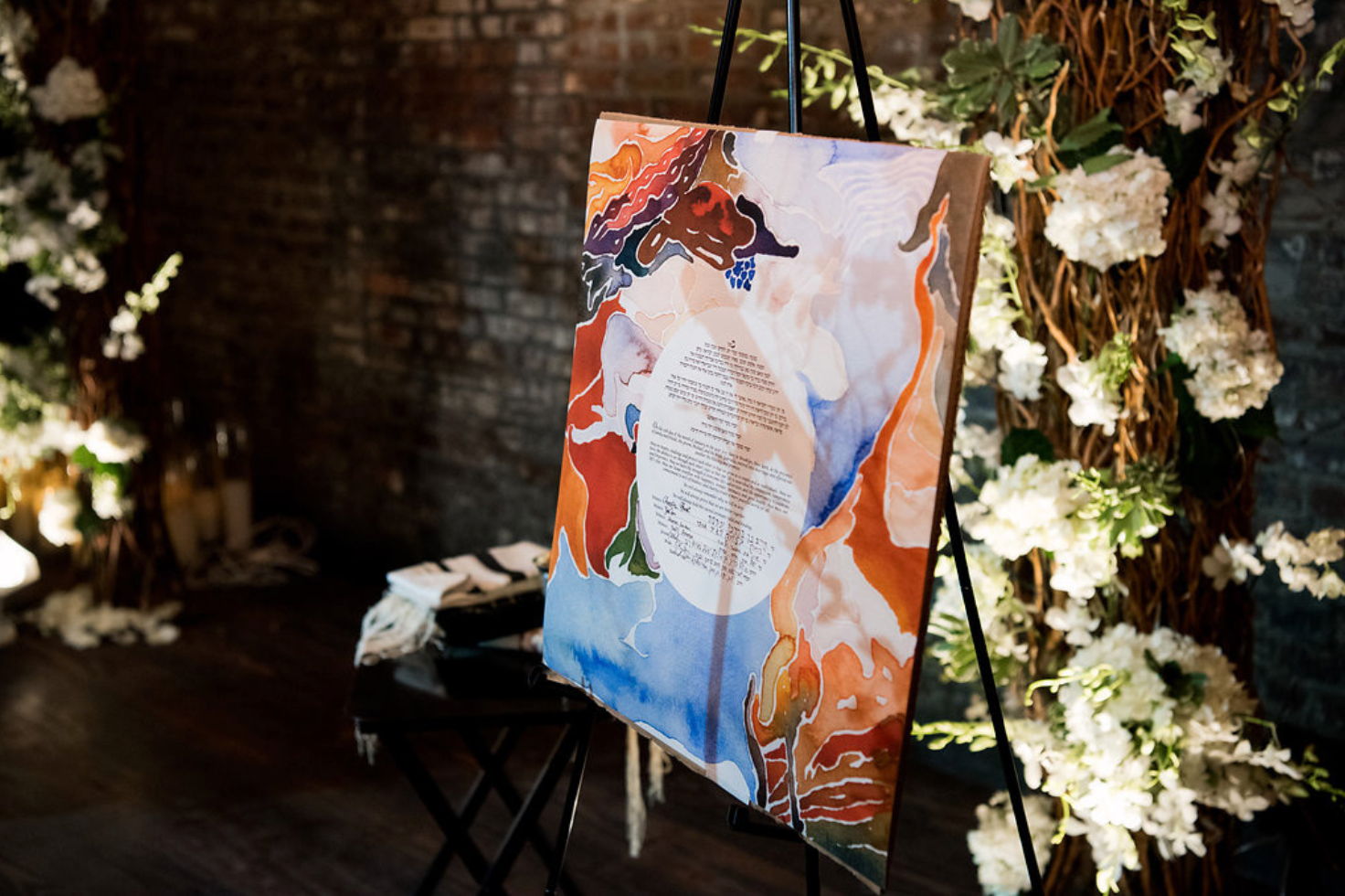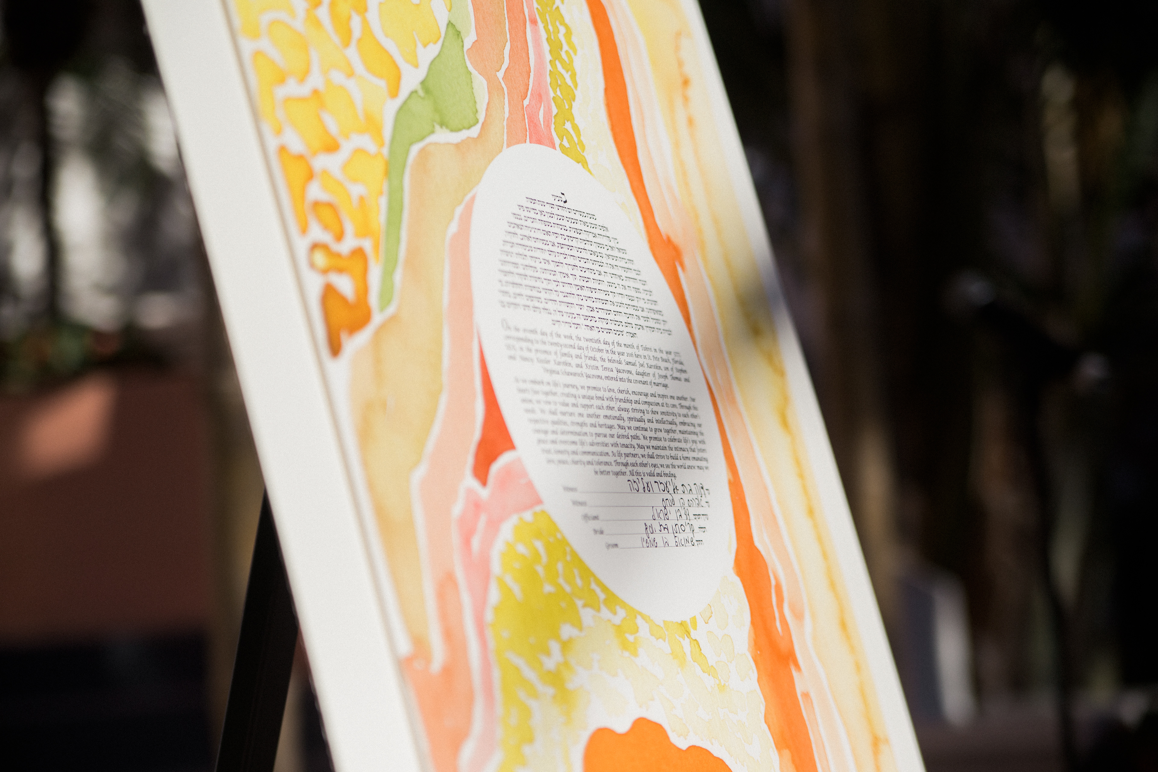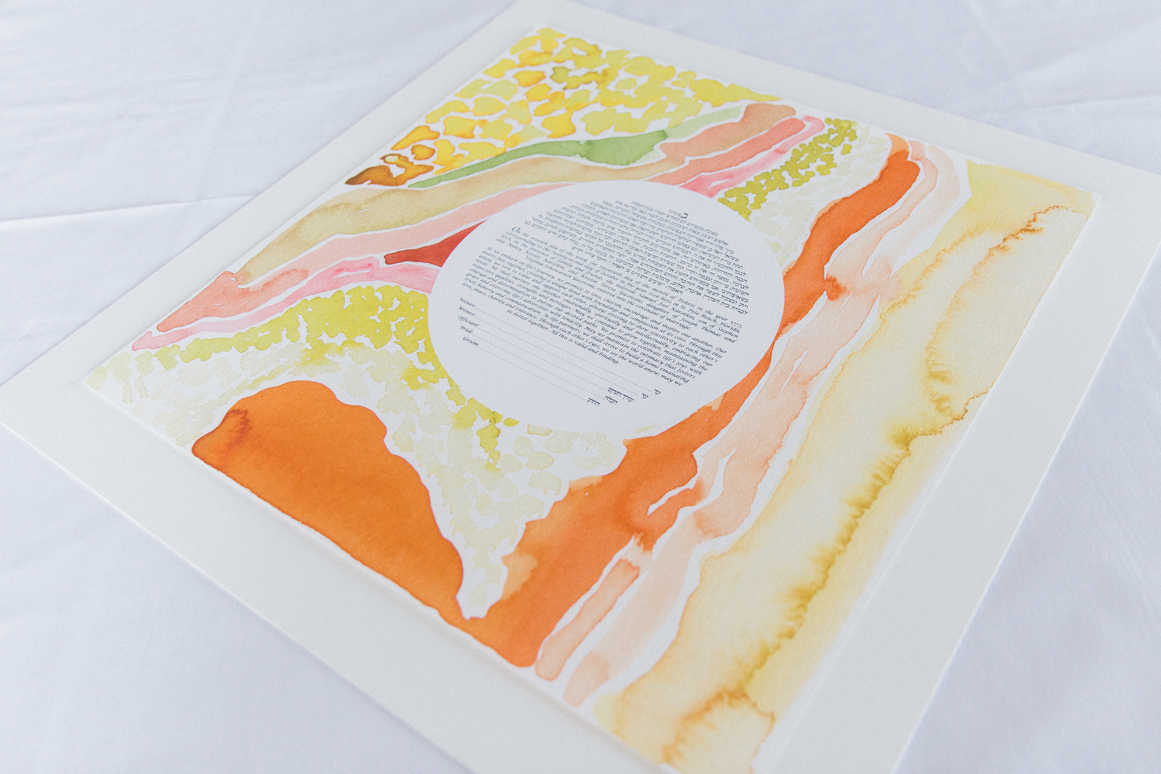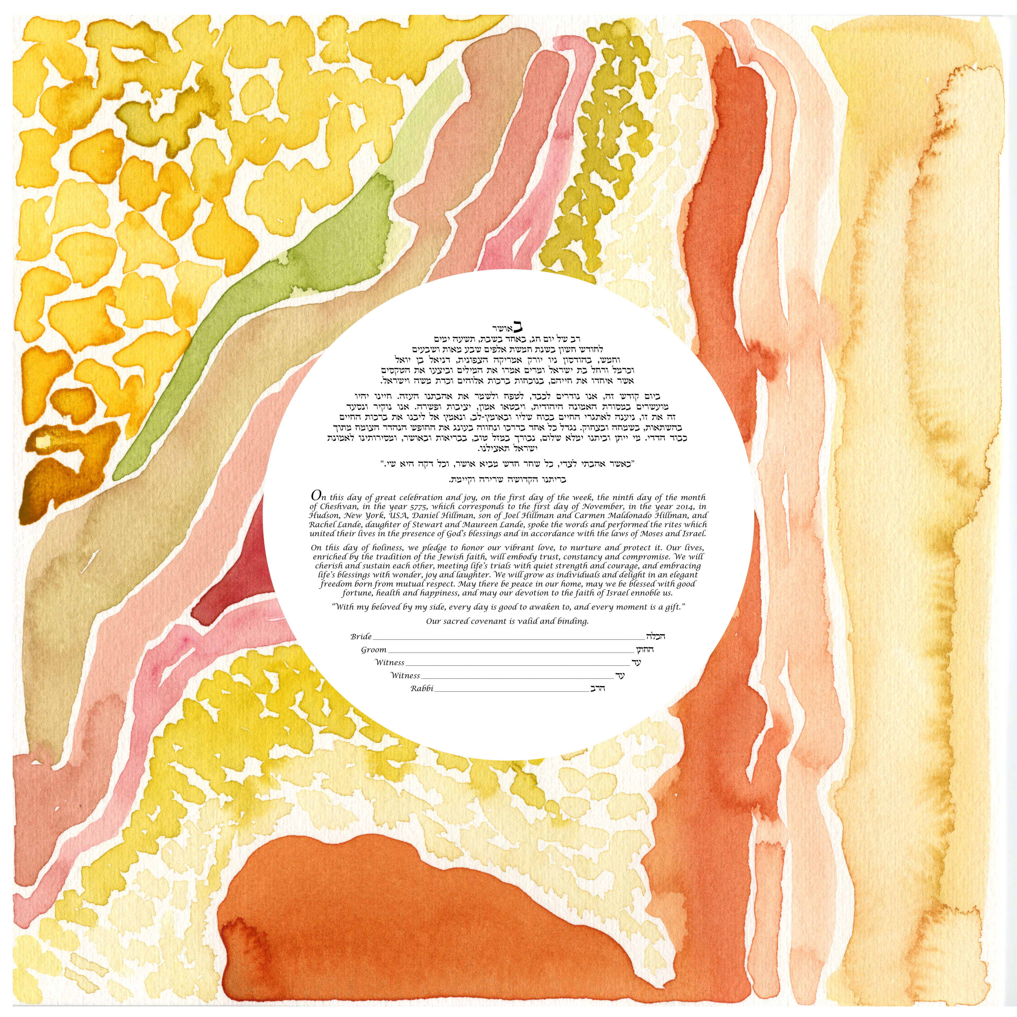 This Ketubah was originally created for a couple getting married in St. Pete Beach, Florida. The warm colors, organic shapes, and bright tones reflected the physical environment of the wedding, as well as the warmth between the couple.