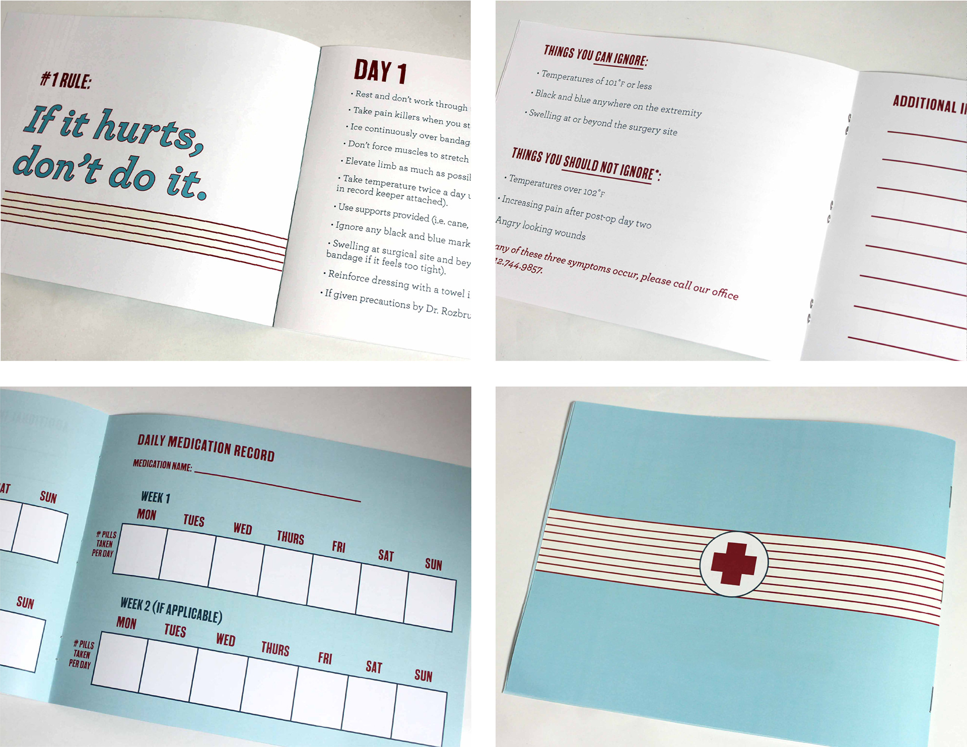 In light of the often cold and impersonal hospital experience these days, I chose to touch the hearts of patients recovering after orthopedic surgeries. I created personalized hospital "departure packs" to provide patients with comfort and security in the days after the operation; in addition, the packs included clear, uncomplicated instructions for continued care at home. The design is intended to hark back to the romantic days of medicine in the 1950s – when candy stripers roamed the hospital and medical packaging was bright and friendly – and bring some of that warmth back into today's hospitals.