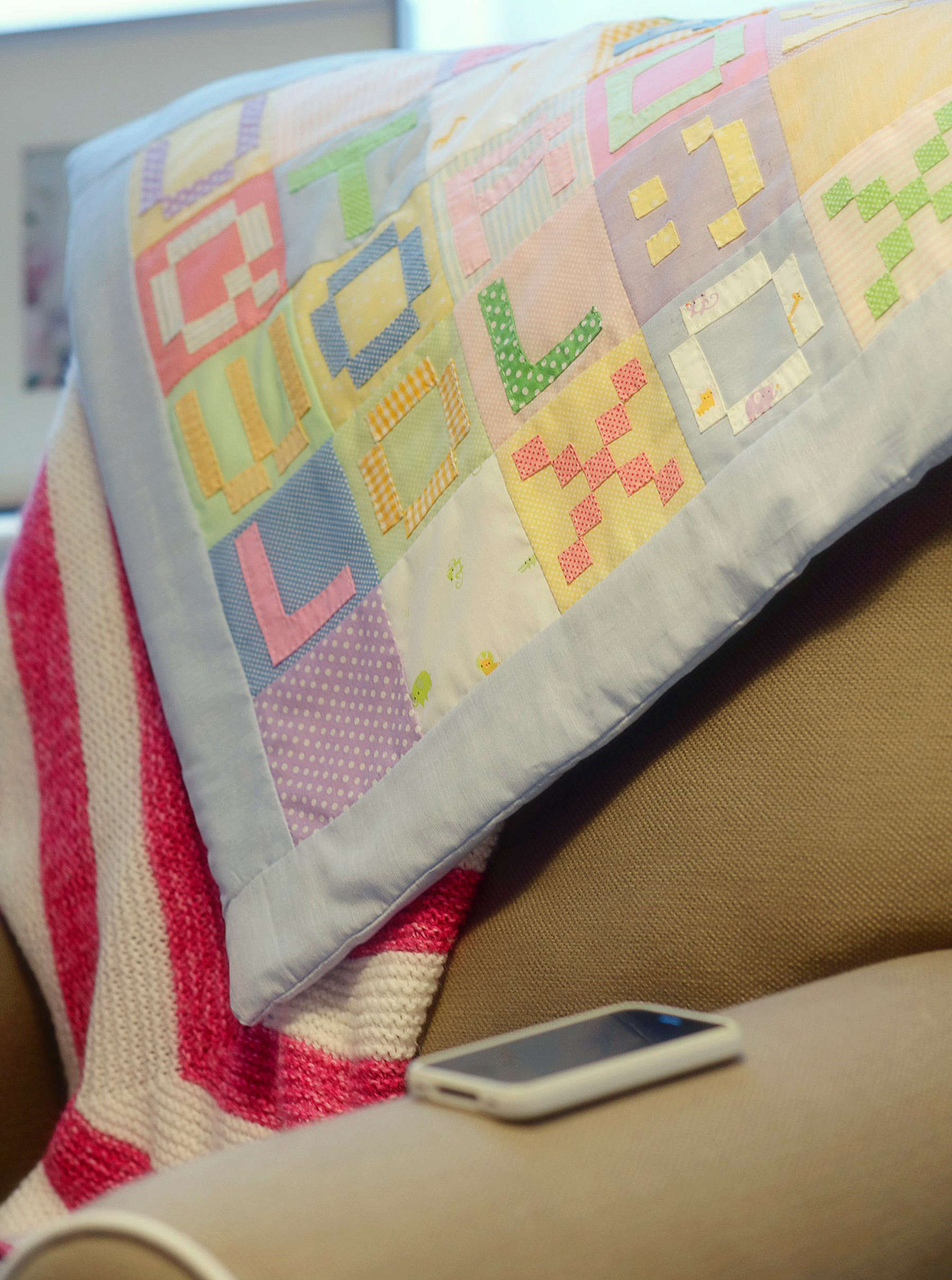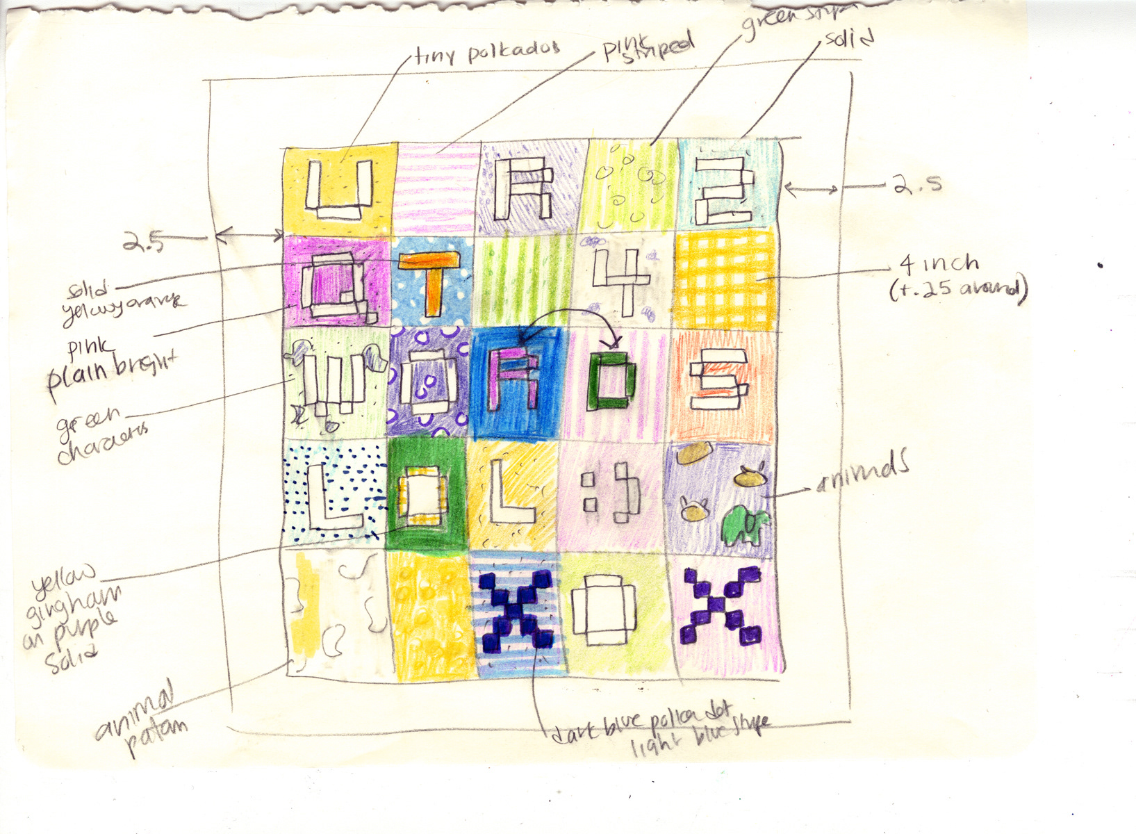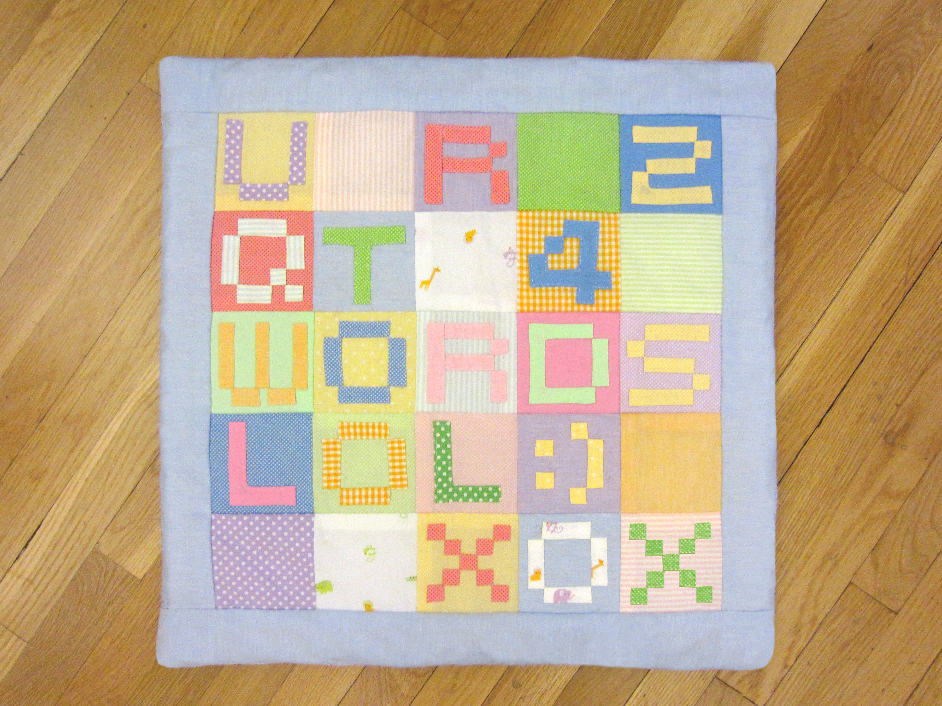 As text and instant message become dominant forms of communication, the English language is being altered and abbreviated for the sake of time and cost. Although text message language (or "textese") can be convenient, it can also be quite harmful to the vocabulary, grammar, and even thinking skills of young children; kids today are learning the abbreviations of words before they learn the words themselves. By embroidering this on-the-go shorthand into the slow, deliberate medium of a baby quilt, I hope to address the potential effects of text message language on future generations of children. (Translated in English: "You are too cute for words. Laugh out loud. Smile. Kisses and hugs")