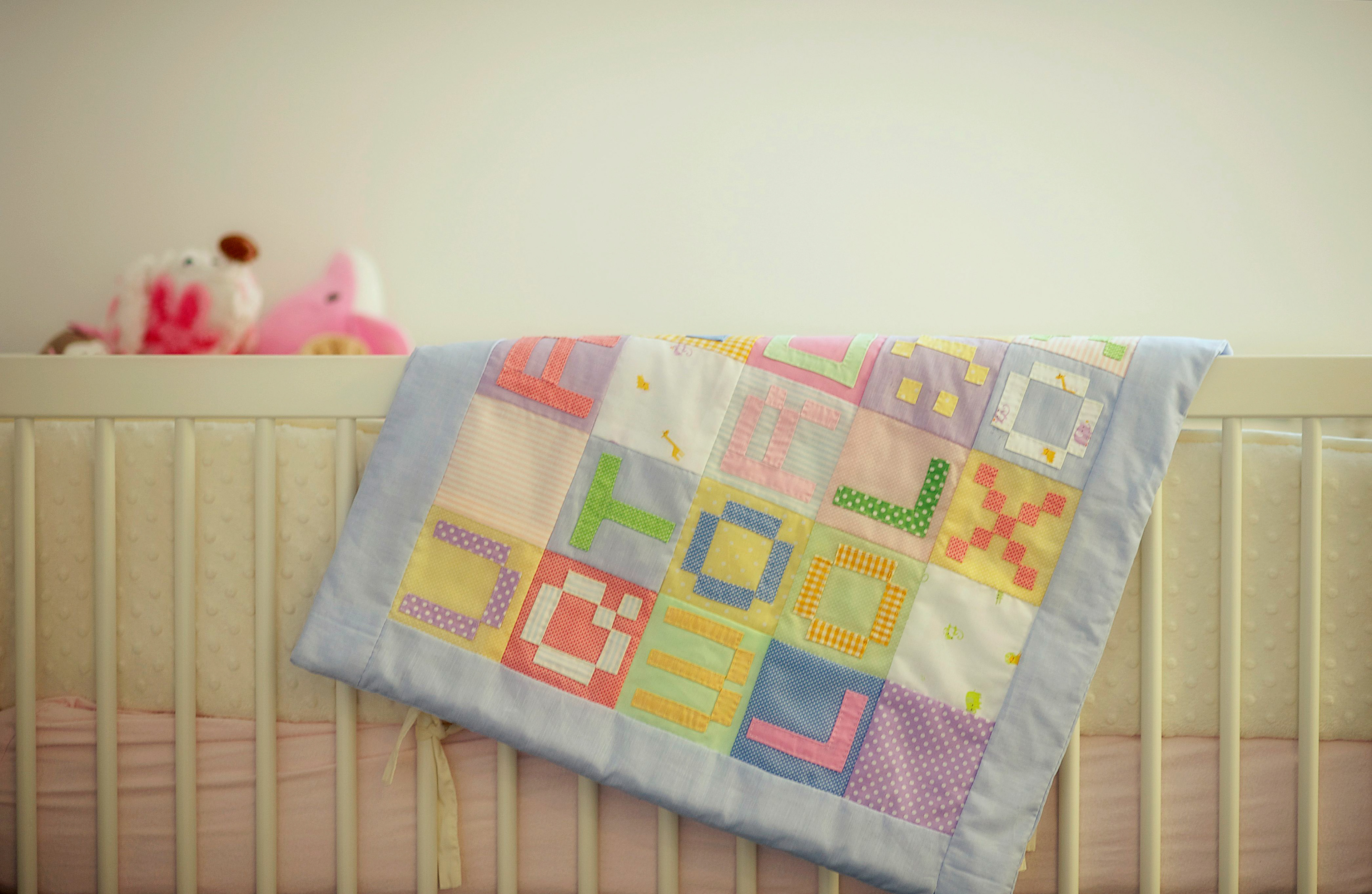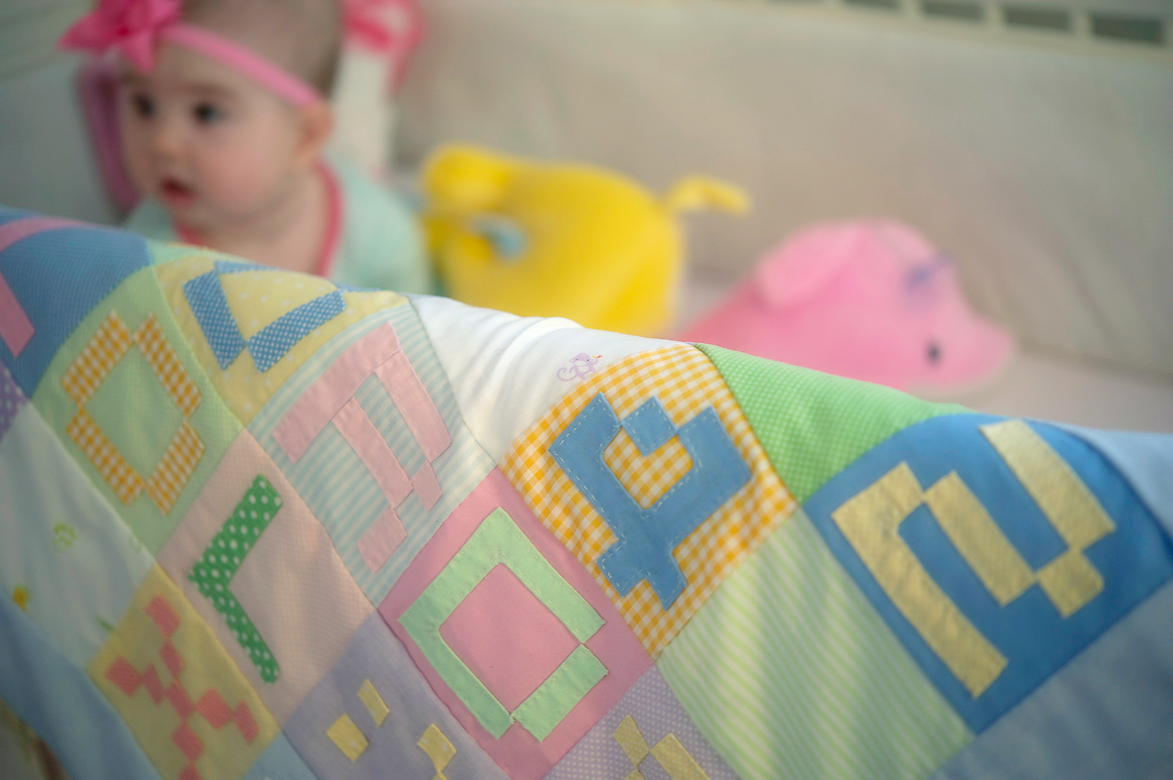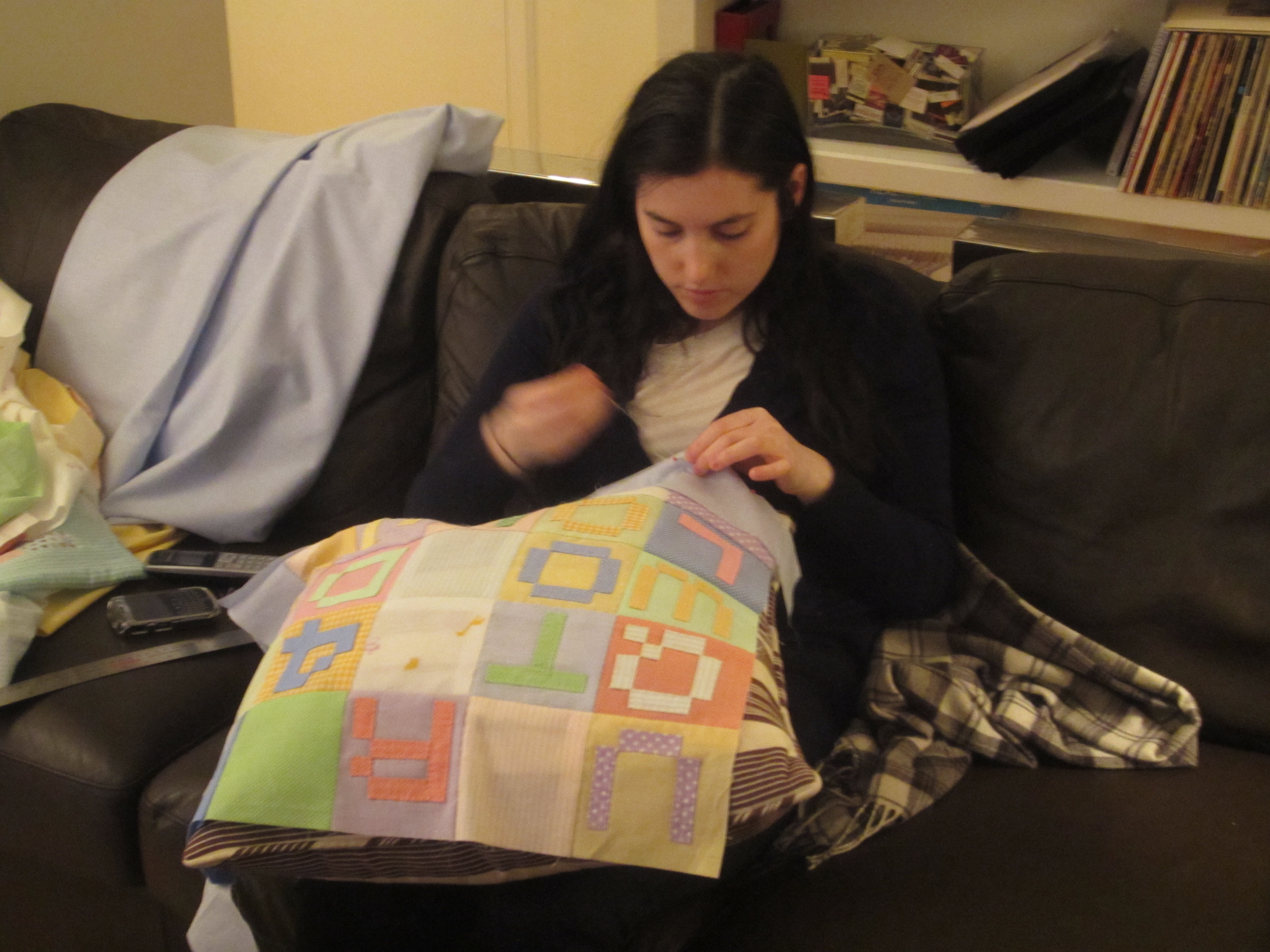 As text and instant message become dominant forms of communication, the English language is being altered and abbreviated for the sake of time and cost. Although text message language (or "textese") can be convenient, it can also be quite harmful to the vocabulary, grammar, and even thinking skills of young children; kids today are learning the abbreviations of words before they learn the words themselves. By embroidering this on-the-go shorthand into the slow, deliberate medium of a baby quilt, I hope to address the potential effects of text message language on future generations of children. (Translated in English: "You are too cute for words. Laugh out loud. Smile. Kisses and hugs")