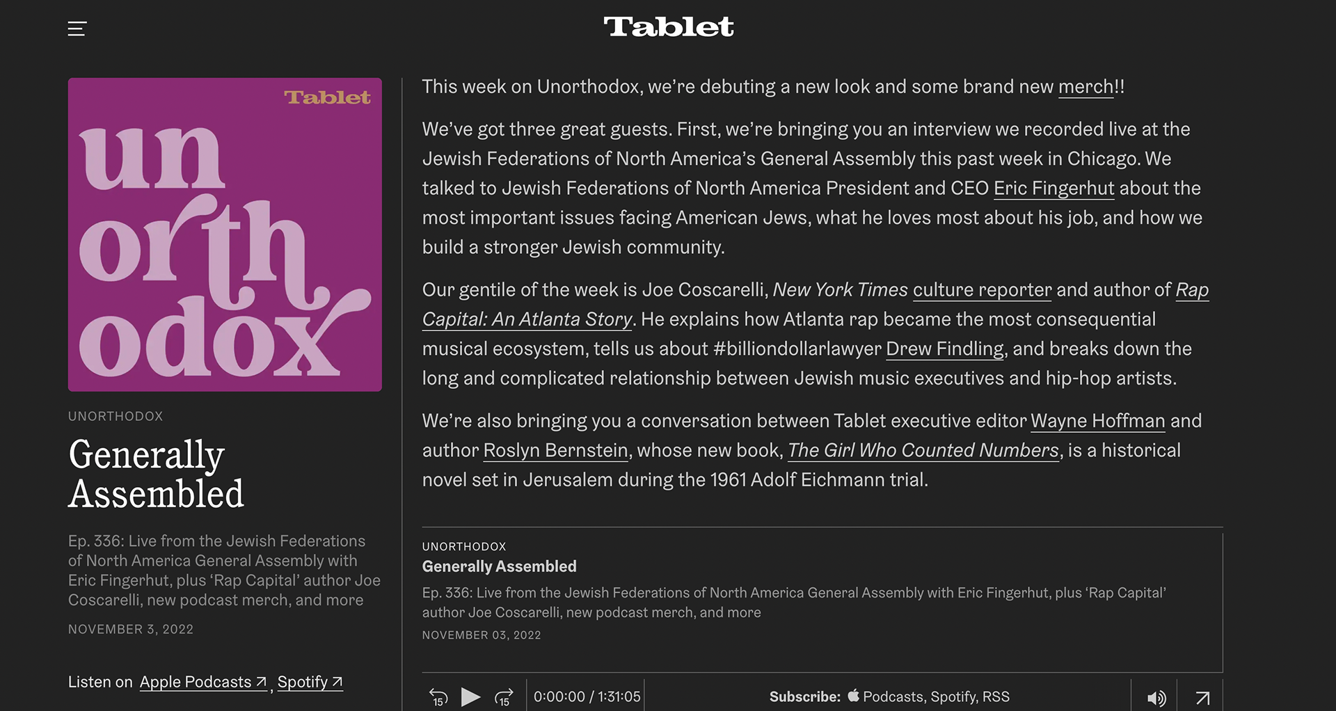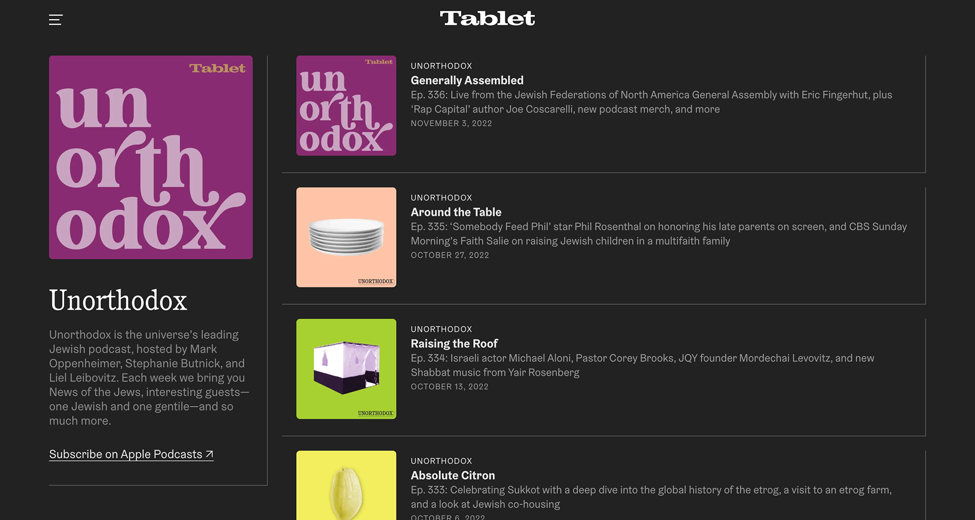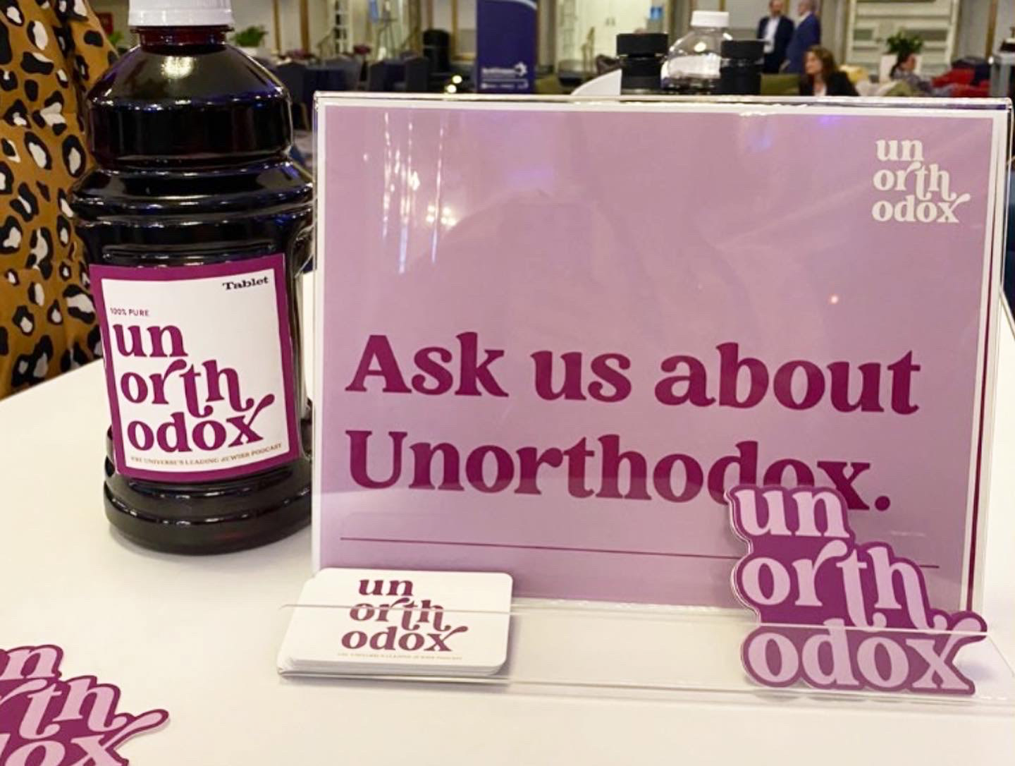 Logo, branding & merchandise design for the "Universe's Leading Jewish Podcast" from Tablet Studios. Hosted by Mark Oppenheimer, Stephanie Butnick, and Liel Leibovitz, Unorthodox brings you News of the Jews, interesting guests—one Jewish and one gentile—and so much more.
