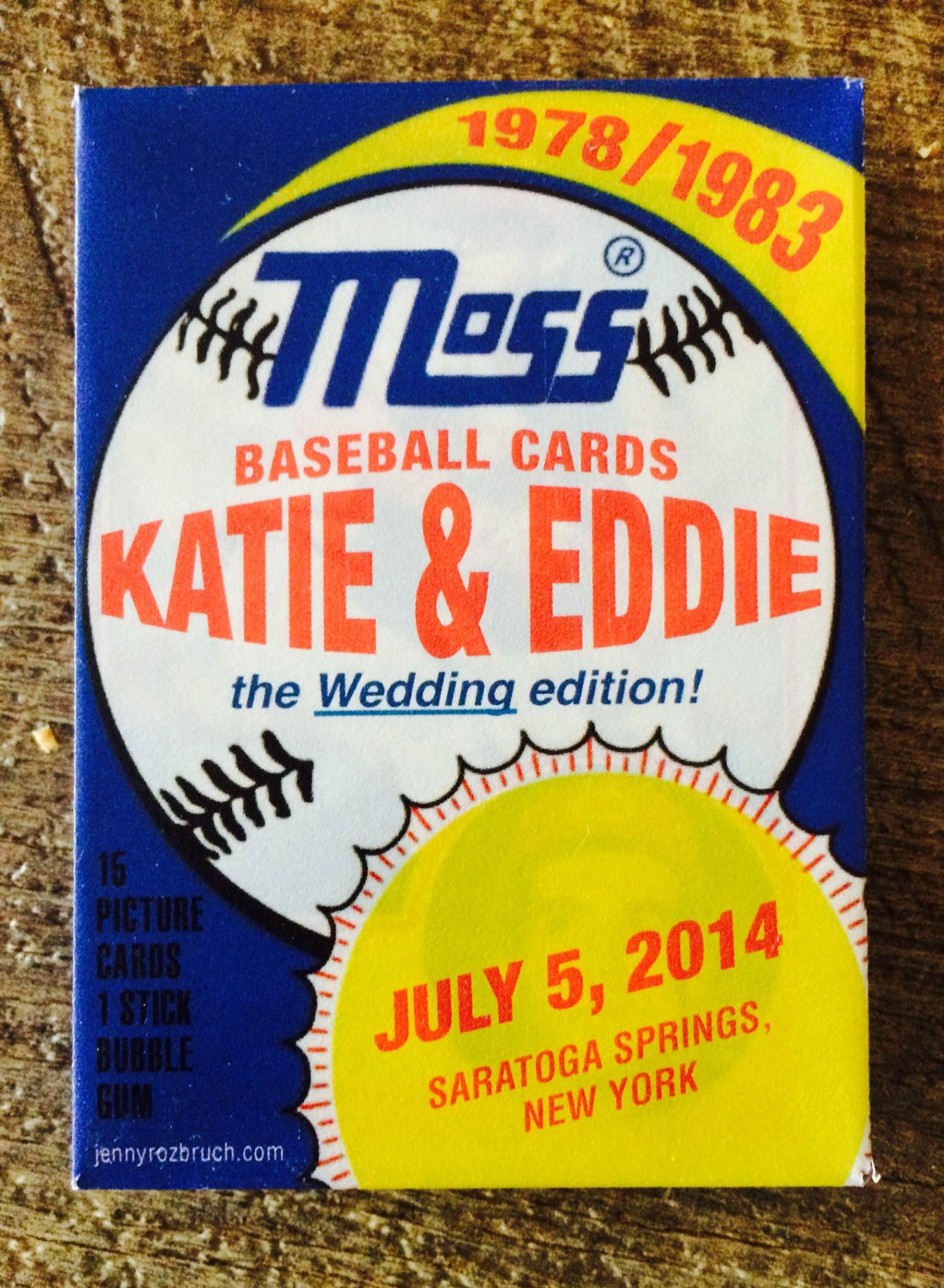 I designed this 80s-inspired wax baseball card packaging for Eddie & Katie's wedding. The couple wanted to create retro-style wax packs, filled with original baseball cards from each of their birth years (along with a stick of gum, of course!), as wedding favors for their guests.